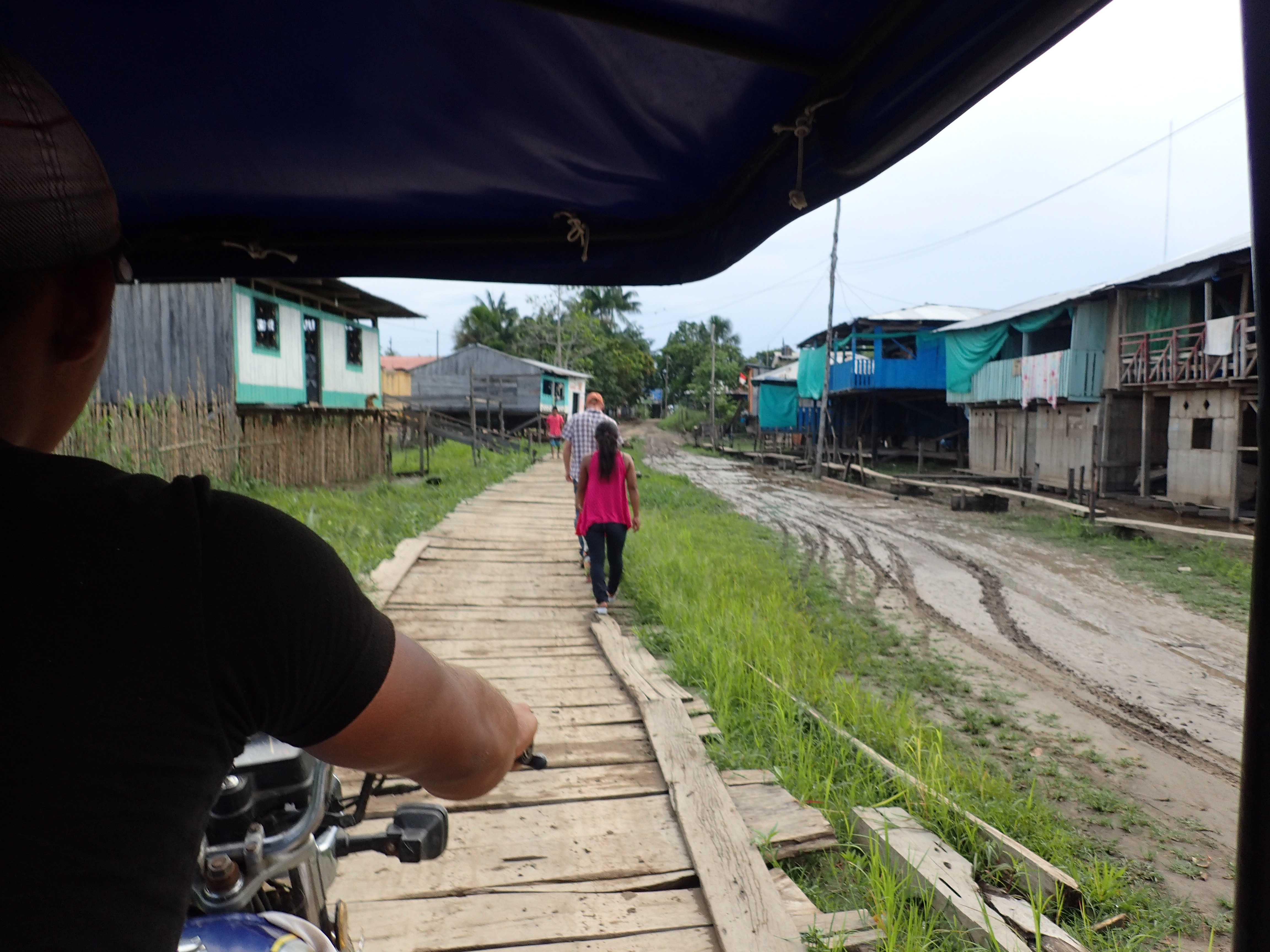 En barque, nous gagnons la berge pour aller effectuer les formalités d’entrée sur le territoire péruvien qui, contrairement à ce que nous avions pu lire, vont s’avérer très rapides. Le village est fort différent de Tabatinga ou Leticia : pas de route asphaltée, des constructions en bois et étonnamment de nombreux bars et plusieurs boîtes de nuit.