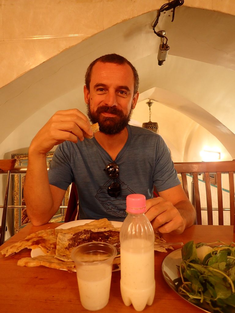 Quand on nous recommande un restaurant de beryani, nous y courons, pensant manger un plat de riz similaire au biryani indien… En fait, point de riz mais du mouton haché servi dans un grand pain ! La végétarienne a passé son tour, Bertrand s’est régalé. La boisson, c’est du dough, une préparation au yaourt comparable au lassi indien.